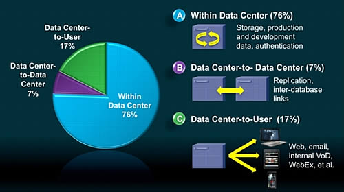 ทราฟฟิกของดาต้าเซ็นเตอร์ส่วนใหญ่ไม่ได้เกิดจากผู้ใช้โดยตรง แต่เกิดจาก ‘เวิร์กโหลดของดาต้าเซ็นเตอร์และคลาวด์คอมพิวติ้ง’ ในการทำงานที่มองไม่เห็น สำหรับช่วงปี 2554-2559 ซิสโก้คาดการณ์ว่าประมาณ 76 เปอร์เซ็นต์ของทราฟฟิกดาต้าเซ็นเตอร์จะยังคงอยู่ภายในดาต้าเซ็นเตอร์ และโดยมากแล้วจะถูกสร้างโดยสตอเรจ กระบวนการผลิต และข้อมูลที่ใช้ในการพัฒนา ทราฟฟิกของดาต้าเซ็นเตอร์อีก 7 เปอร์เซ็นต์จะถูกสร้างขึ้นระหว่างดาต้าเซ็นเตอร์ ซึ่งเป็นผลมาจากการรีพลิเคตข้อมูลและการอัพเดตซอฟต์แวร์/ระบบ ส่วนที่เหลืออีก 17 เปอร์เซ็นต์ของทราฟฟิกดาต้าเซ็นเตอร์เป็นผลมาจากการที่ผู้ใช้เข้าถึงระบบคลาวด์ในการท่องเว็บ รับส่งอีเมล และวิดีโอสตรีมมิ่ง