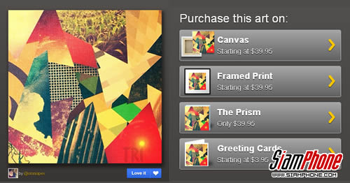 ภาพสวยๆ ของคุณบน Instagram นอกจากเปามาตกแต่งบ้านคุณเองแล้ว ก็สามารถสร้างรายได้ให้คุณได้เช่นเดียวกัน แต่ไม่จำเป็นต้องไปเปิดร้านหรือไปนั่งขายให้เมื่อย เมื่อคุณสามารถเปิดร้านค้าออนไลน์ และขายภาพของคุณได้ถูกลิขสิทธิ์ ในเว็บ Instacanvas และเมื่อมีผู้สั่งซื้อรูปของคุณ ทางเว็บไซต์จะจัดพิมพ์ตามไซส์ขนาดที่สั่ง แล้วจัดส่งให้เสร็จสรรพ คุณก็แค่รอรับเงินอย่างเดียว