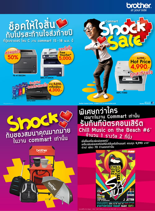 บริษัท บราเดอร์ คอมเมอร์เชี่ยล (ประเทศไทย) ผู้นำด้านเทคโนโลยีเครื่องพิมพ์ ที่ครอบคลุมถึงการพิมพ์ที่เหมาะตั้งแต่ผู้ใช้ตามบ้าน สำนักงานขนาดกลาง และย่อม ไปจนองค์กรขนาดใหญ่ จัดโปรโมชั่นShock Sale ที่เห็นใครเห็นแล้วต้องช็อค ในงานคอมมาร์ต คอมเทค 2012 ยกขบวนสินค้าคุณภาพมาลดราคา แถมของสมนาคุณมากมาย พร้อมรับบัตรกำนัลมูลค่าสูงสุด 5,000 บาท ทั้งเครื่องพิมพ์เลเซอร์และแอลอีดี เครื่องอิงค์เจ็ทมัลติฟังก์ชั่น และเครื่องพิมพ์ฉลากพี-ทัช (P-Touch), ตลับหมึกเครื่องพิมพ์, เทปพิมพ์ฉลาก พร้อมรับบัตรชมคอนเสิร์ต Chill Music on the Beach #6 ฟรี เพียง 70 รางวัลเท่านั้น พบกันได้ที่บูธผลิตภัณฑ์บราเดอร์ 15-18 พ.ย. ศกนี้ ณ ศูนย์ประชุมแห่งชาติสิริกิติ์ สอบถามรายละเอียดเพิ่มเติมได้ที่ 02-950-2930 หรือ http://welcome.brother.com/th-th.html