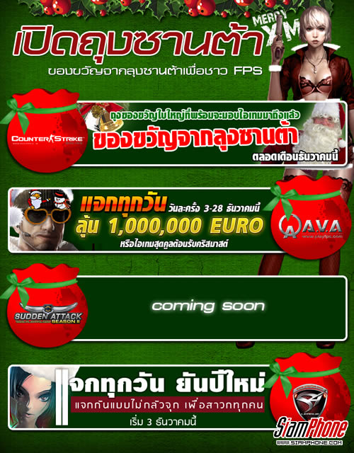 ส่วน A.V.A ลุงซานต้าก็มาพร้อมกิจกรรมแจกแหลก แจกทุกวัน ลุ้น 1,000,000 EURO หรือไอเทมสุดคูลกันไปเลยฟรีๆ เพียงแค่เข้าไปกด like facebook PlayFPS และกดรับรางวัลจากเกม A.V.A เพียงเท่านี้ก็ได้ร่วมลุ้นรับไอเทมฟรีๆ จากลุงซานต้ากันแล้ว