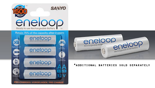 สำหรับแบตเตอรี่ที่ใช้ร่วมกับอุปกรณ์ชาร์จตัวนี้ได้แก่แบตเตอรี่ขนาด AA eneloop เพียง 2 ก้อนเท่านั้นก็สามารถทำให้ผู้ใช้ชาร์จแบตเตอรี่ให้มือถือได้ถึง 90 นาทีผ่านทางสาย USB ที่รองรับทั้งเครื่อง labtop มือถือ หรืออุปกรณ์เล่นเกมส์แบบพกพา