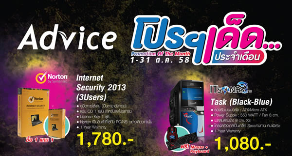 แอดไวซ์ (Advice) ผู้นำธุรกิจร้านค้าไอทีและสมาร์ทโฟน รายใหญ่ มีเครือข่ายครอบคลุมกว่า 350 สาขาทั่วประเทศไทย จัดโปรโมชั่นพิเศษประจำเดือนตุลาคม 2558 ทั้งลด ทั้งแถม หั่นราคาท้าลมหนาว เอาใจนักช๊อปกับสินค้าไอทีหลากหลายทางเลือกกับโปรโมชั่นโดนๆ 6 รายการที่แอดไวซ์จัดมาเพื่อคุณ