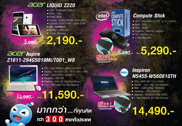 - Intel Compute Stick คอมพิวเตอร์ตั้งโต๊ะ ในขนาดพกพา ที่มาพร้อมโปรเซสเซอร์ Intel Atom Z3735F 1.83GHz และระบบปฏิบัติการที่เลือกได้ระหว่าง Windows 8.1 หรือ Ubuntu กับหน่วยความจำในตัว 32GB แสดงผลแบบ HD ราคาปกติ 5,890 บาท เหลือเพียง 5,290 บาท รับฟรีทันที Mouse, Keyboard Wireless Rapoo