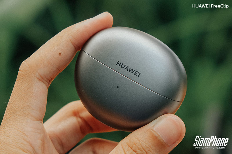 เคสของ HUAWEI FreeClip มีดีไซน์แบบมนๆ กลมๆ คล้ายฝาหอย และด้านบนเป็นฝาเปิดปิดด้านหน้ามีโลโก้ HUAWEI และขยับมาด้านล่างเป็นไฟแจ้งสถานะ