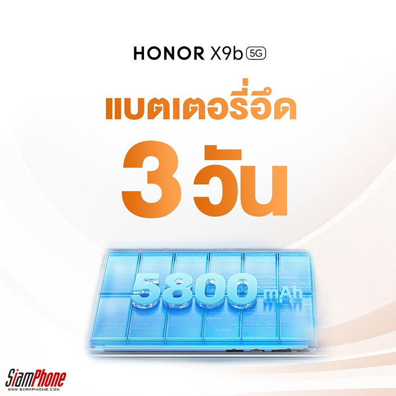 อีกจุดที่สร้างความน่าสนใจให้กับ HONOR X9b คือ การยกระดับการใช้งานที่ยาวนานสูงสุด 3 วัน ด้วยแบตเตอรี่ขนาดใหญ่ 5800mAh ซึ่งสามารถจ่ายไฟให้กับอุปกรณ์ได้ทั้งวัน ทำให้ผู้ใช้เพลิดเพลินกับความบันเทิงอย่างยาวนานได้ในทุกที่ทุกเวลา และประสิทธิภาพของแบตฯ ยังมีความทนทาน โดยหลังจากผ่านการชาร์จไปแล้ว 1,000 ครั้ง ยังคงสุขภาพของแบตเตอร์รี่ได้ถึง 80% ซึ่งบอกได้เลยว่าสำหรับแบตฯ ของรุ่นนี้ ถือเป็นหนึ่งในแบตเตอรี่โทรศัพท์ที่อึดที่สุดในตลาดเลยก็ว่าได้