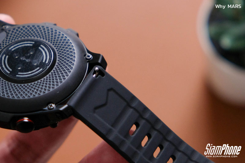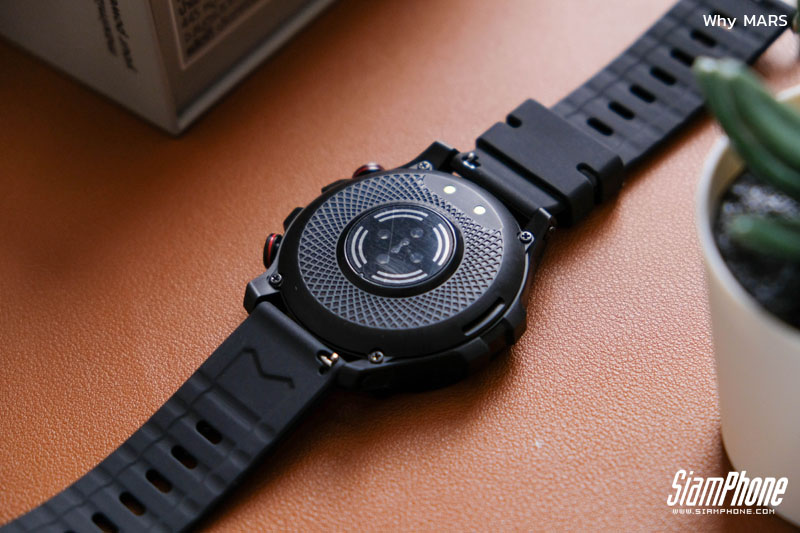 ด้านหลังตัวเรือนมีจุดเซ็นเซอร์สำหรับวัดค่าต่างๆ ในโหมดสุขภาพ รวมถึงพินแม่เหล็กสำหรับการชาร์จแบตเตอรี่เข้าเครื่อง