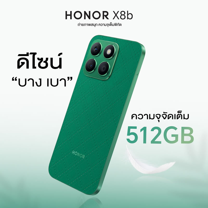 HONOR X8b ตัวเครื่องมีขนาดบาง 6.78 มิลลิเมตร น้ำหนัก 166 กรัม ต้องบอกว่าทั้งบางและเบามาก ใครที่ไม่ชอบพกพาสมาร์ทโฟนหนักๆ รุ่นนี้ถือว่าตอบโจทย์เลย มาพร้อมเทคโนโลยีชาร์จเร็ว 35 วัตต์ (มีอะแดปเตอร์แถมให้ในกล่องด้วย) โดยทางแบรนด์เคลมว่าเซลล์แบตเตอรี่ยังเก็บประจุไฟฟ้าได้ดี นอกจากนี้มีฟีเจอร์สร้าง RAM เสมือนได้อีก 8GB เมื่อรวมกับสเปคเครื่องทำให้มี RAM สูงสุด 16GB