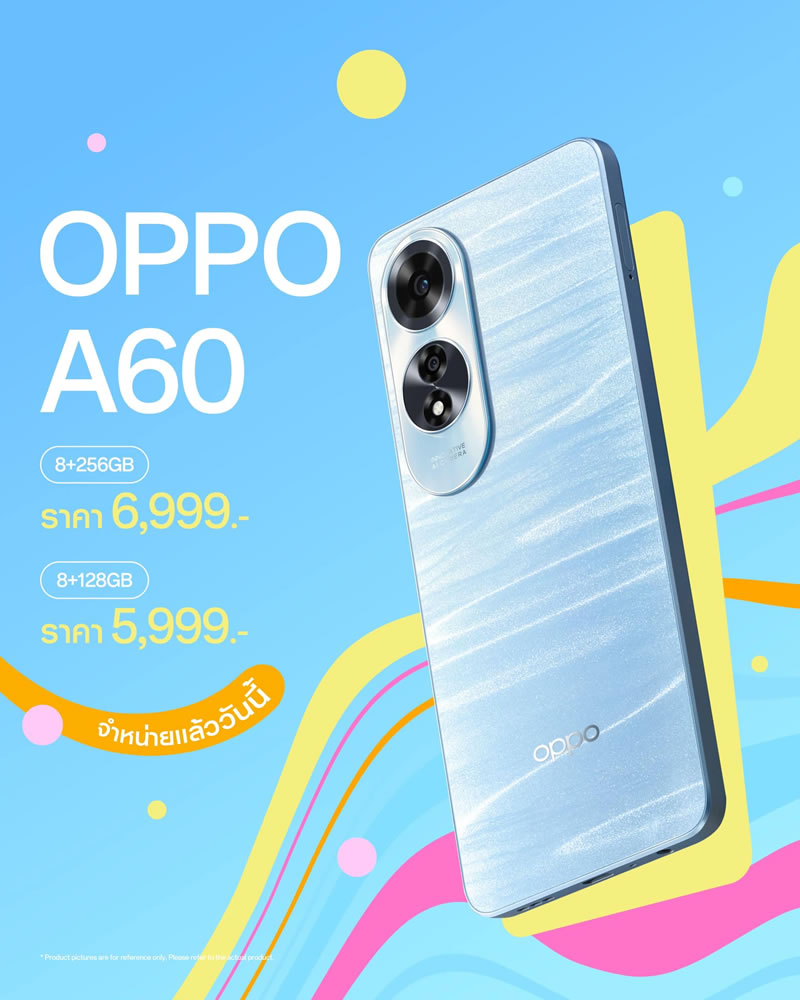 OPPO A60 มี 2 เฉดสีให้เลือก ได้แก่ Ripple Blue และ Midnight Purple เคาะราคา 5,999 สำหรับโมเดล RAM 8GB + ROM 128GB และราคา 6,999 บาท กับโมเดล RAM 8GB + ROM 256GB เมื่อซื้อแล้วรับของแถม OPPO 3IN1 Gift Box มูลค่า 699 บาท