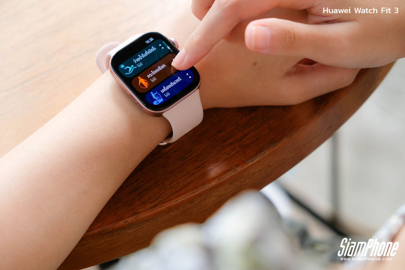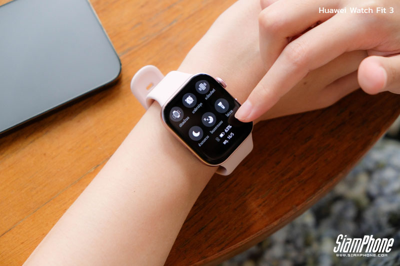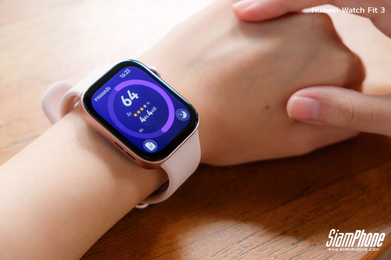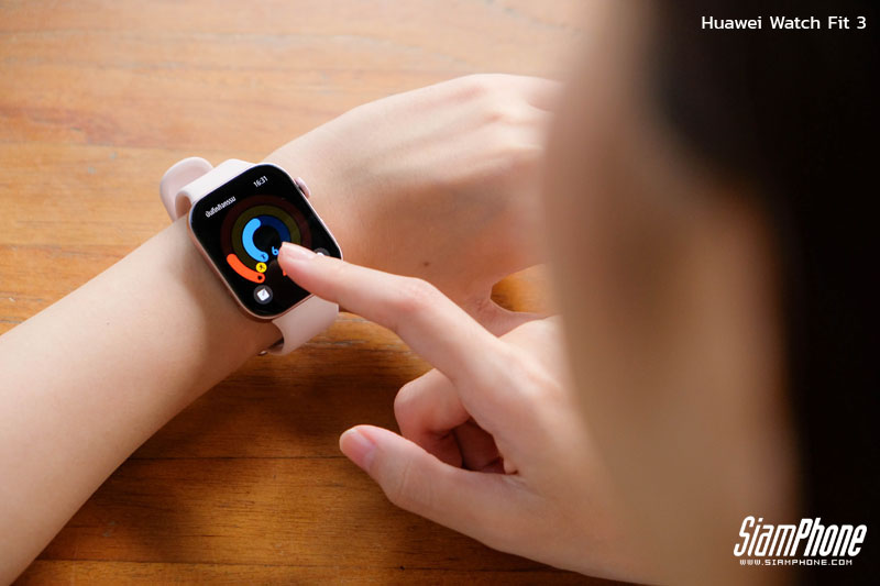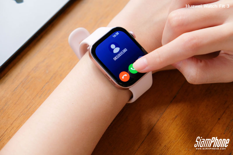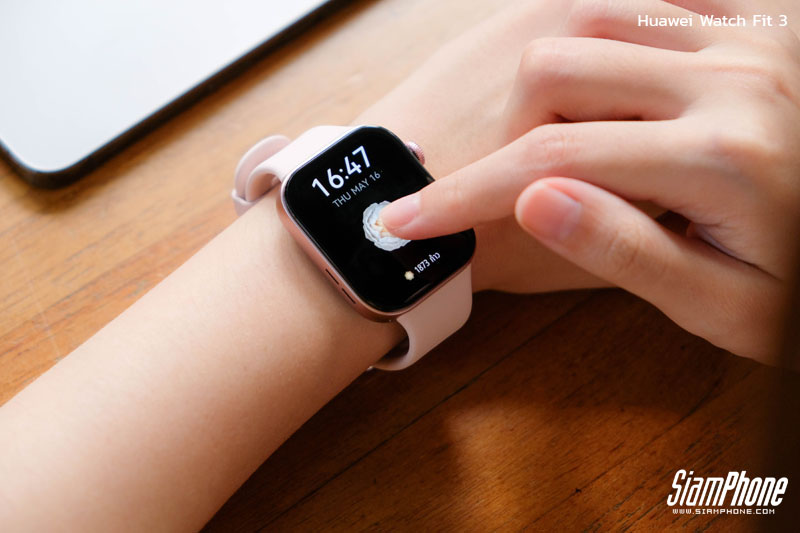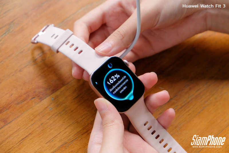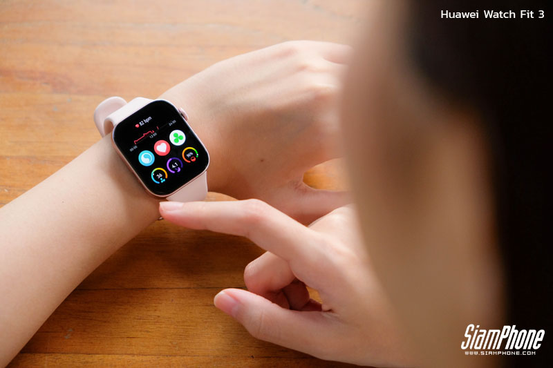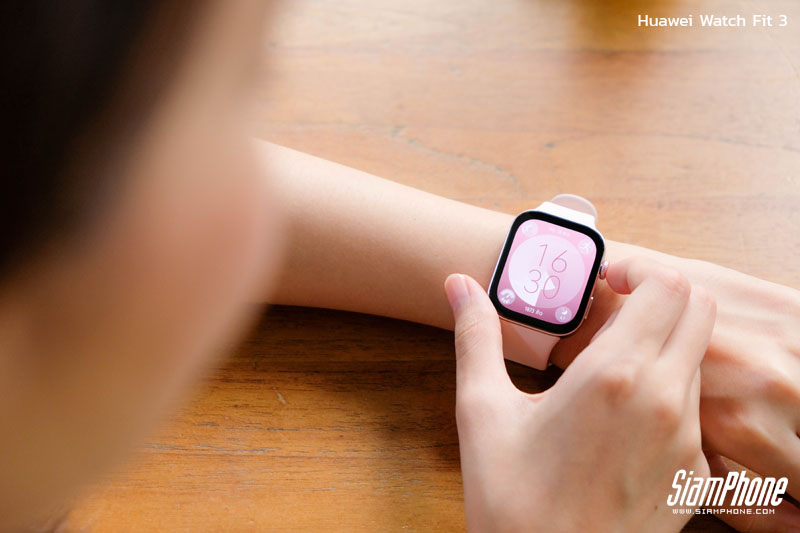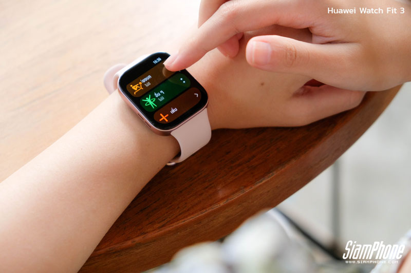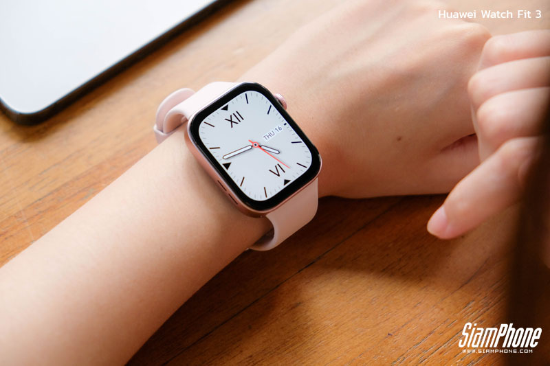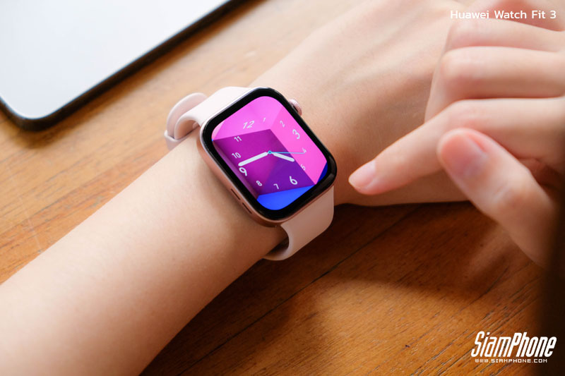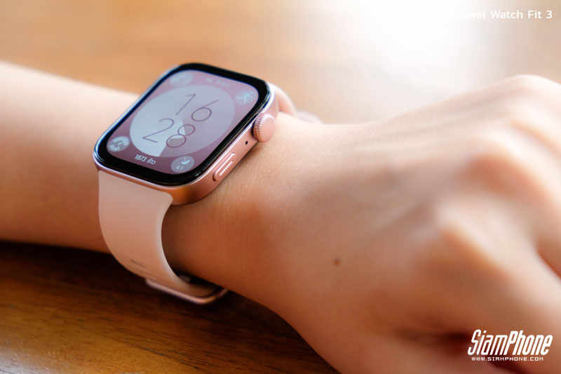 HUAWEI WATCH FIT3 หน้าจอ AMOLED ดีไซน์สี่เหลี่ยม ขนาด 1.82 นิ้ว ถือว่าเป็นขนาดจอที่กำลังดี ไม่ใหญ่และไม่เล็กจนเกินไป ขนาดตัวเครื่อง 43.2 × 36.3 × 9.9 มม. น้ำหนัก 26 กรัม (ไม่รวมสายข้อมือ) น้ำหนักเบาจนไม่มีความรู้สึกว่าหนักข้อมือ ตัวเครื่องทำจากวัสดุอะลูมิเนียมอัลลอย (Aluminum Alloy) ให้ความรู้สึกพรีเมี่ยมแบบสุดๆ