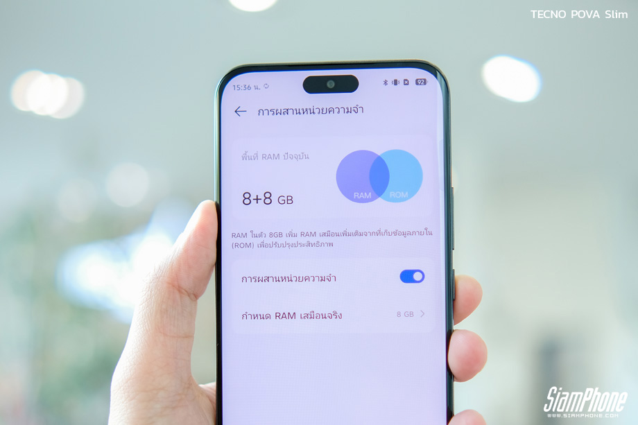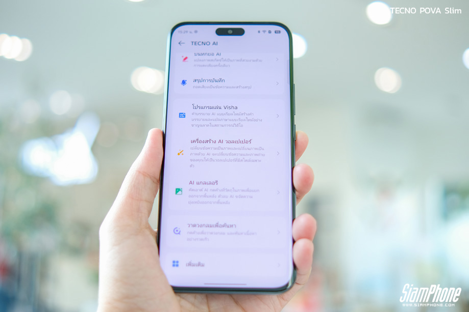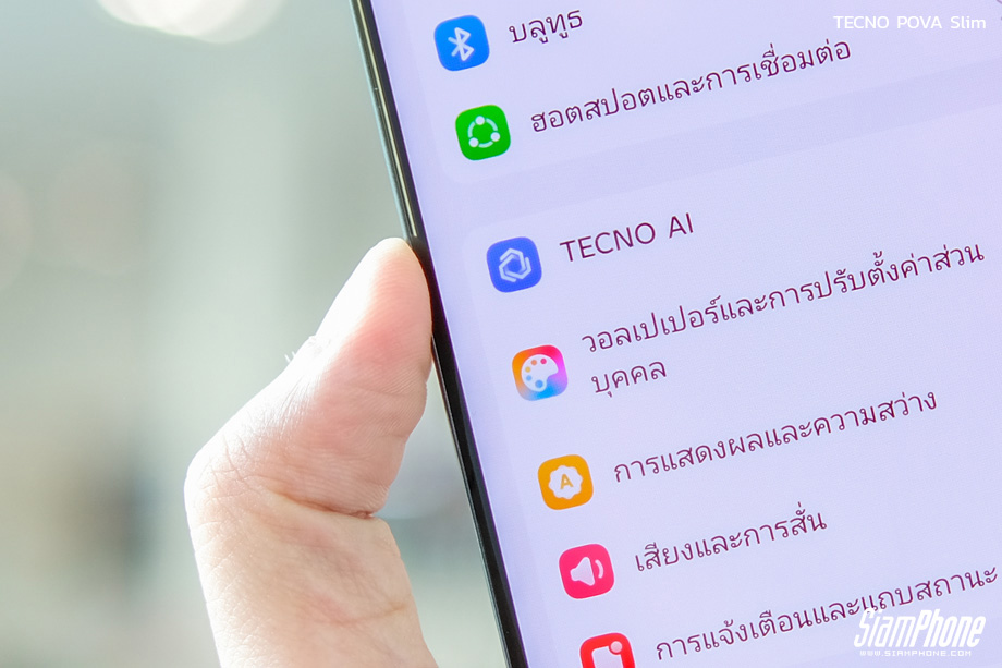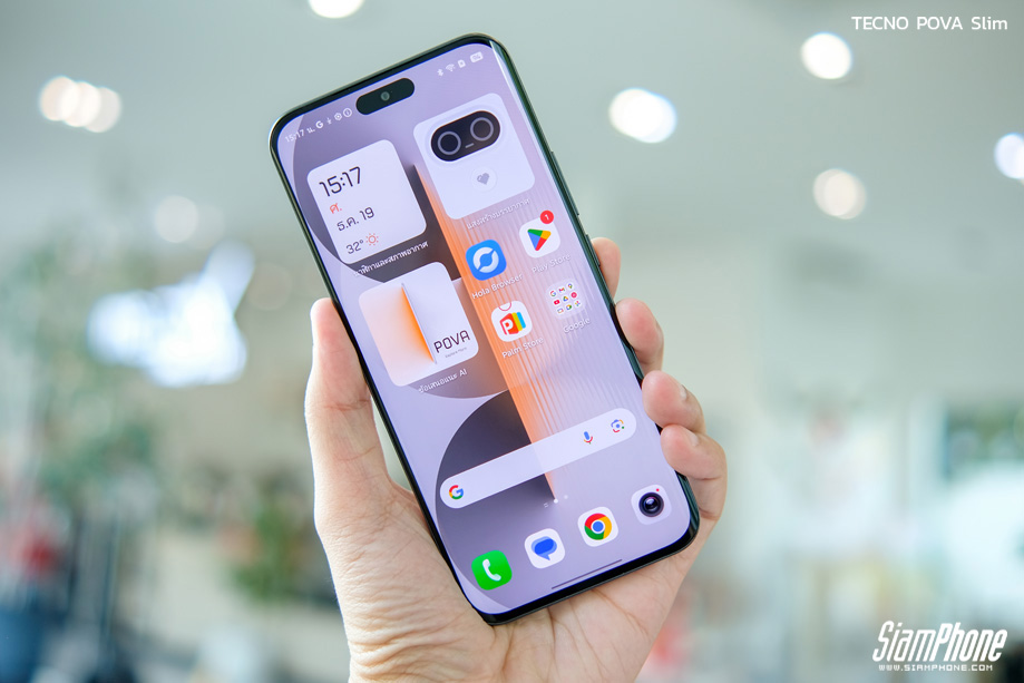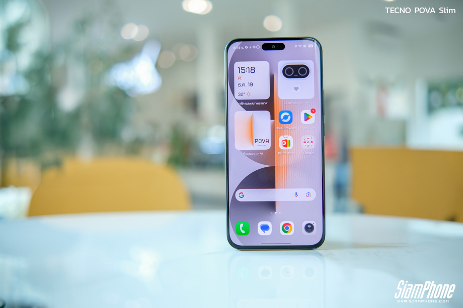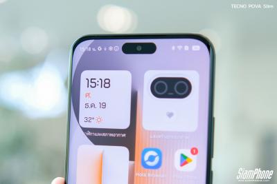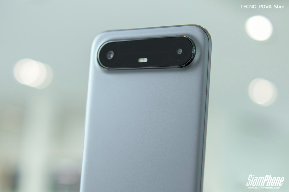 - ตัวเครื่องและวัสดุ: ฝาหลัง TECNO POVA Slim ผลิตจาก Flagship-grade Fiberglass หนาเพียง 0.36 มม. แต่แข็งแรงกว่าเดิม 300% ตัวเครื่องเป็นดีไซน์ 3D Ultra-slim โค้งรับอุ้งมือ