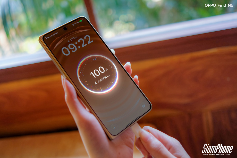 เพื่อการใช้งานที่ต่อเนื่องตลอดวัน OPPO Find N6 มาพร้อมแบตเตอรี่ซิลิคอน-คาร์บอนความจุขนาดใหญ่พิเศษถึง 6000mAh ซึ่งออกแบบมาให้เพียงพอต่อการใช้งานบนหน้าจอหลักขนาดใหญ่อย่างเต็มที่ และเมื่อต้องการชาร์จพลังงาน ตัวเครื่องก็รองรับเทคโนโลยีชาร์จเร็วผ่านสาย 80W SUPERVOOC และรองรับการชาร์จไร้สาย 50W AIRVOOC นอกจากนี้ ด้านการเชื่อมต่อยังมาพร้อมเทคโนโลยี AI LinkBoost และ NetworkBoost Chip S1 ที่ทำงานร่วมกับระบบเสาอากาศ Fold Antenna Matrix ช่วยเพิ่มประสิทธิภาพความเสถียรของสัญญาณให้รวดเร็วขึ้น 30% ถึง 40% แม้จะอยู่ในพื้นที่อับสัญญาณก็ตาม