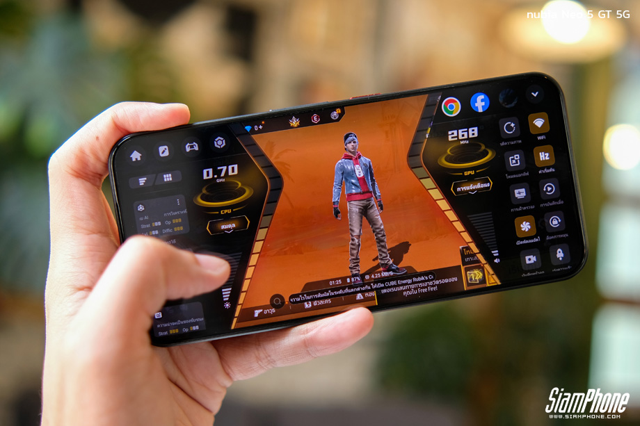พัดลมในตัวหนึ่งเดียวในคลาส นี่คือจุดขายที่แข็งแกร่งที่สุด nubia Neo 5 GT เป็นสมาร์ตโฟนเพียงรุ่นเดียวในระดับราคานี้ที่มี พัดลมระบายความร้อนในตัว (Built-in Fan) พร้อมโครงสร้าง Through-Flow Duct Design ซึ่งเป็นการระบายความร้อนเชิงรุก (Active Cooling) แบบเดียวกับ REDMAGIC ลมเย็นจะถูกดูดผ่านช่องทางเดินลมเพื่อระบายความร้อนออกจาก CPU และแบตเตอรี่โดยตรง ต่างจากคู่แข่งที่ต้องซื้อพัดลมแยกมาติดภายนอกซึ่งเกะกะและกินพลังงานแบตเตอรี่สมาร์ตโฟน