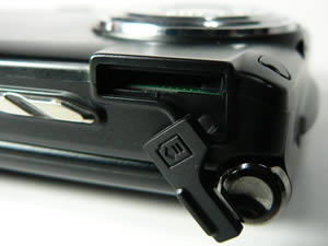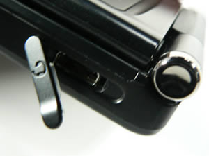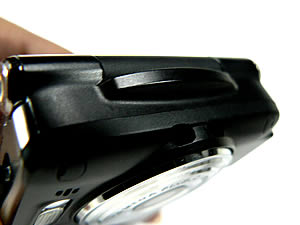 ด้านซ้ายของเครื่อง - ส่วนบนสุดจะเป็นช่องเสียบชุดหูฟังซึ่งมีที่ปิดกันฝุ่น ลงมาด้านล่างจะเป็นปุ่มชัตเตอร์สำหรับถ่ายรูป