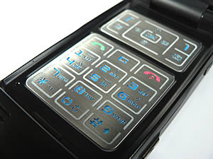 ด้านใน - เมื่อเปิดฝาพับกางออกจนสุด ส่วนบนสุดของฝาพับมีลำโพงเสียงสำหรับสนทนาถัดลงมาเป็นจอแสดงผลหลัก ส่วนตัวเครื่องจะเป็นแป้นพิมพ์หรือปุ่มกดซึ่งมีลักษณะพิเศษเป็นแผ่นสีเงินแผ่นเดียววางราบเรียบกับตัวเครื่องเหมือนปุ่มกดระบบสัมผัส ที่มุมซ้ายล่างของแป้นพิมพ์จะมีรูไมค์ใช้ในการสนทนา ส่วนด้านล่างตัวเครื่องจะเป็นลำโพงเสียงสองตัวแบบสเตอริโอ ซึ่งแม้ปิดฝาพับก็จะยังเห็นลำโพงอยู่