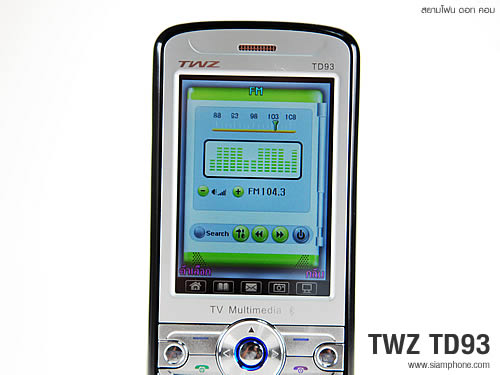วิทยุ FM Radio TWZ TD93 รับฟังวิทยุในระบบ FM โดยใช้เสาอากาศรับสัญญาณ (เสาเดียวกับรับสัญญาณโทรทัศน์) จึงสามารถฟังผ่านลำโพง โดยไม่ต้องเสียบชุดหูฟัง มีระบบการค้นหาช่วยเลือก ค้นหาึคลื่นความถี่วิทยุ โดย กดเลื่อน ปุ่มควบคุม ซ้าย, ขวา เพื่อเลือกสถานีที่ต้องการ หรือเลือกค้นหาคลื่นความถี่อัตโนมัติ บันทึกสถานี โปรดได้ 9 ช่องสัญญาณ สามารถบันทึกเสียงจากรายการวิทยุและ เล่นวิทยุเป็นพื้นหลัง เมื่อออกจากโปรแกรมได้