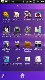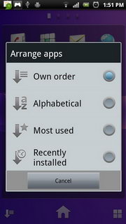 การเรียงแอพพลิเคชั่นทำได้โดยกดปุ่มมุมซ้ายล่าง แบ่งออกเป็น 4 รูปแบบ ได้แก่ เรียงด้วยตนเอง, เรียงตามตัวอักษร, เรียงตามจำนวนการใช้งาน และเรียงตามเวลาที่ติดตั้ง