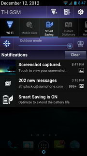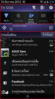 ในหน้าต่างแจ้งเตือน แบ่งเป็นสองส่วนย่อย ส่วนบนจะแสดงไอคอนเปิด-ปิดการเชื่อมต่อ Wi-Fi, 3G, โหมดประหยัดพลังงาน, พจนานุกรม, Wi-Fi HotSpot, Bluetooth, GPS ฯลฯ ส่วนล่างเป็นข้อความแจ้งเตือนต่างๆ สามารถกดเข้าไปดูรายละเอียดแบบเต็มได้