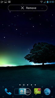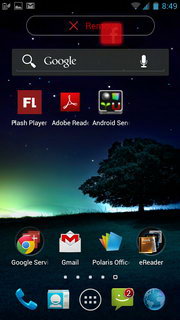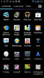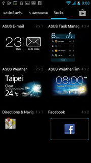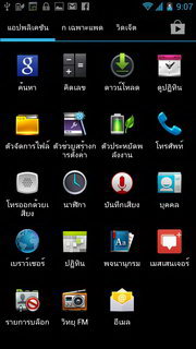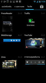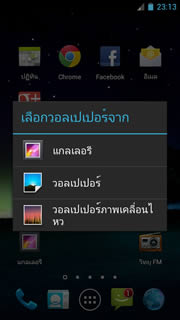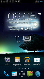 - ส่วนกลาง แสดงพื้นหลัง, ไอคอน, widget สามารถวางไอคอนได้สูงสุด 4x5 แถว ต่อหนึ่งหน้าจอหลัก สามารถจัดการไอคอนได้ดังนี้
