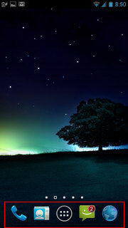 - ส่วนล่าง แสดงไอคอนหลัก 5 ไอคอน ซึ่งหน้าจอหลักทุกหน้าจะเป็นแบบเดียวกัน เรียงไอคอนจากซ้ายไปขวา ได้แก่ โทรศัพท์, รายชื่อ, ทางเข้าหน้าแอพพลิเคชั่น, ข้อความ, อินเทอร์เน็ต ไอคอนทั้งหมดนี้สามารถใช้งานได้เช่นเดียวกับไอคอนปกติ ยกเว้นไอคอนโทรศัพท์และไอคอนทางเข้าแอพพลิเคชั่นซึ่งไม่สามารถย้ายหรือแก้ไขได้