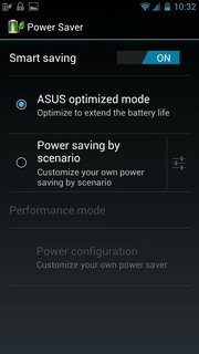Power Saver แอพฯ ประหยัดพลังงานแบตเตอรี่ เมื่อเปิดใช้จะช่วยให้ใช้งานสมาร์ทโฟนและแท็บเล็ตได้ยาวนานขึ้น สามารถเลือกโหมดประหยัดพลังงานได้ 2 โหมด คือแบบที่ ASUS ตั้งค่ามา หรือแบบกำหนดเอง (เลือกปรับเฉพาะบางอย่างได้)
