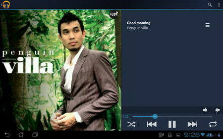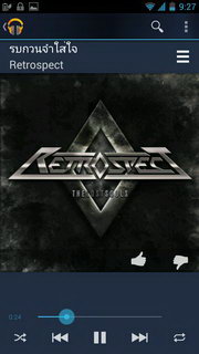 ในหน้าเครื่องเล่นเ้พลง แสดงข้อมูลเพลงและศิลปิน, แสดงหน้าปกเพลง (ถ้ามี), ด้านล่างมีแถบเวลาเล่นเพลงที่ปรับเลื่อนได้พร้อมกับปุ่มควบคุมเพลงพื้นฐาน, ปุ่มเล่นเพลงซ้ำ, เล่นเพลงสุ่ม, ปุ่มชอบเพลง, ปุ่มไม่ชอบเพลง