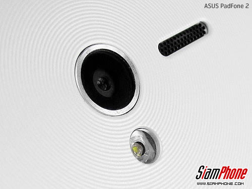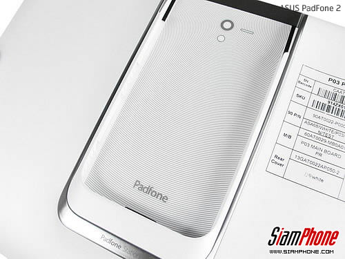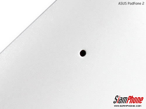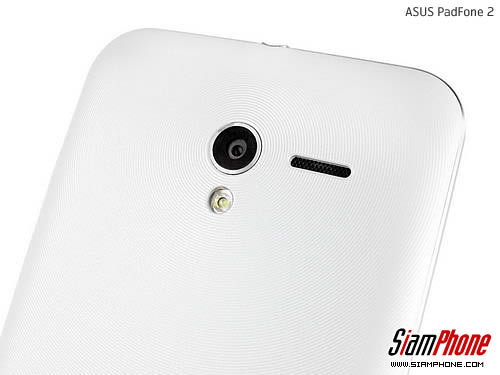 ด้านหลังตัวเครื่อง มีฝาหลังพื้นผิวเรียบ มุมขอบโค้งเข้าหาตัวเครื่องด้านหน้า ตรงกลางนับจากด้านบนลงมามีช่องเสียบ ASUS Padfone 2
