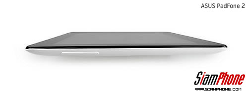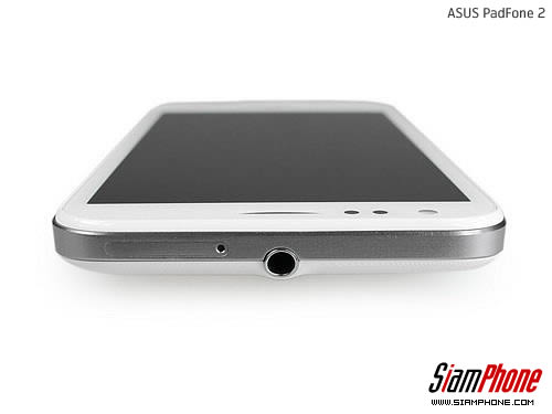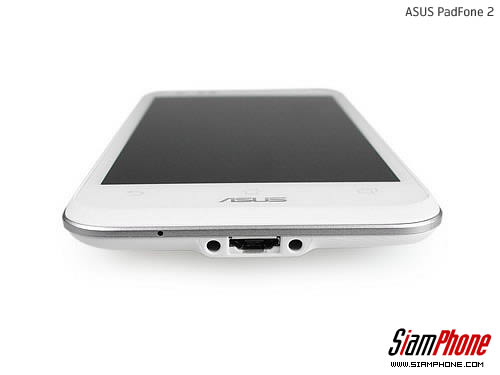 ด้านล่างตัวเครื่อง มีพอร์ต microUSB ที่ออกแบบมาเพื่อ ASUS Padfone 2 ตัวล็อคจะแน่นขึ้นและพอดีสำหรับนำไปเสียบเข้ากับ ASUS Padfone 2 Stationถัดไปทางซ้ายมีช่องไมโครโฟนขนาดเล็ก